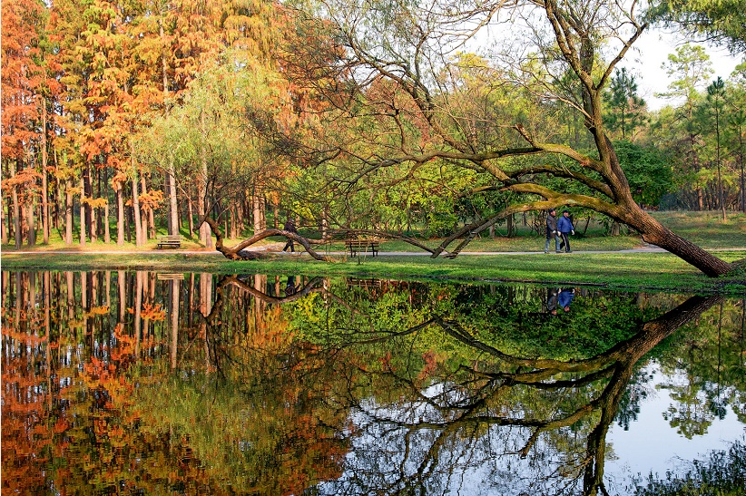 “第一湾”是共青森林公园的标志性景点,位于幽篁居东侧,碧绿的湖水清澈见底,春夏秋冬,岸边的风景各具特色,春季垂柳苍翠欲滴,梦幻的紫荆花分外撩人;夏季香樟郁郁葱葱,阵阵微风,沐浴清凉;