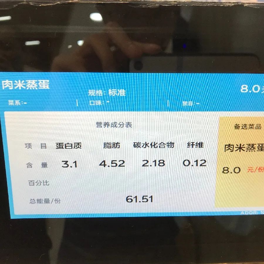 爱博五村长者食堂的菜品档口处有几块小显示屏引人注意。显示屏上会列出每道菜的营养成分,蛋白质、脂肪、碳水化合物、纤维含量分别是多少,一道菜摄入的能量总共有多少,都清晰可见。老人看一眼就能够对所选菜品的营养成分含量一目了然,方便根据自身情况进行选择。