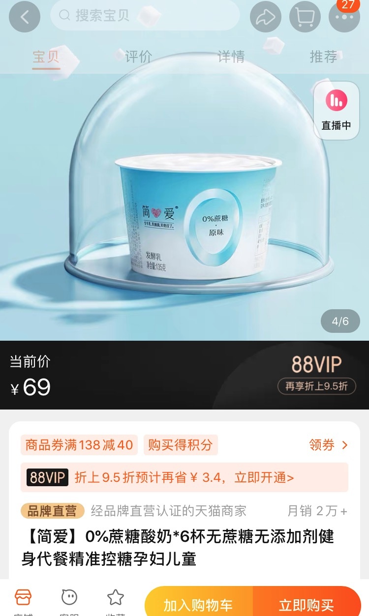 在天猫品牌旗舰店可查看到,简爱0%蔗糖酸奶售价69元/6杯,合一杯11.5元左右。