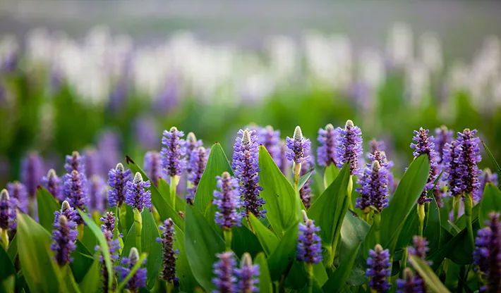 进入夏季,共青森林公园内的多种水生植物盛放,十分美丽的蓝紫色梭鱼草便是其中一种。