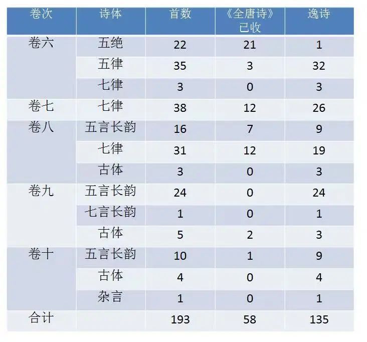 以上统计没有考虑蜀刻十卷本误收及《全唐诗》曾收残句的因素。据此可以看到,在各体诗写作方面,以往我们读到张祜诗歌,以五律和绝句为主,现在可以了解他各体诗的写作能力。古体、杂言诗虽总体不多,以往仅见两篇,现在可见十篇;五言长韵,后代习称五言排律之作,以往仅见8篇,且篇幅都很短,现在可见40篇,且有多篇四十韵以上的大篇,就更显珍贵;七律以往得见24篇,目前得见多达72篇,确实是大大地丰富了。