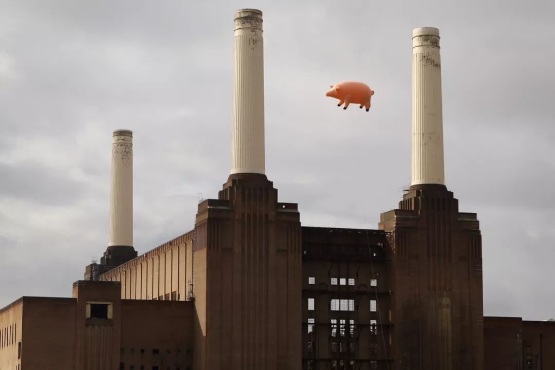 1976年12月,伟大的平克·弗洛伊德(Pink Floyd)乐队捅了大篓子——为了拍摄专辑《Animals》封面,他们放了一只粉红色高9米的充气猪(Algie),由澳大利亚艺术家 Jeffrey Shaw 创作,飘荡在伦敦泰晤士河畔的巴特西发电站(Battersea Power Station)上空。国家航空机关不得不警告伦敦所有飞行员“有一只猪在天上”。