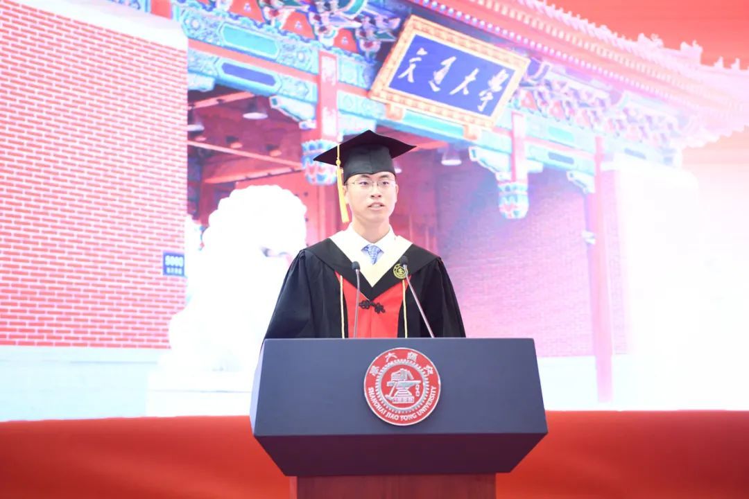 致远学院张振作为毕业生代表发言。作为一名交大人,他早已立下做一等事业的志向,而今将与在座毕业生们一起背起行囊把青春融入祖国的山河。