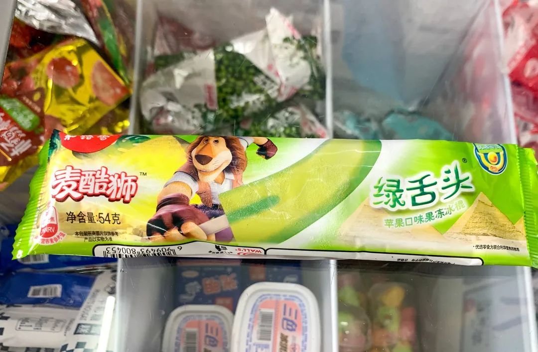 绿舌头可以说是小时候最好玩的冰淇淋之一了,绝大部分人买它出于好玩的心理绝对大于好吃的。刚刚打开包装袋时,它看起来还和普通冰棒没什么区别,过一会儿舔得稍微融化一些,就变得像舌头一样软,吃到嘴里是果冻的口感。