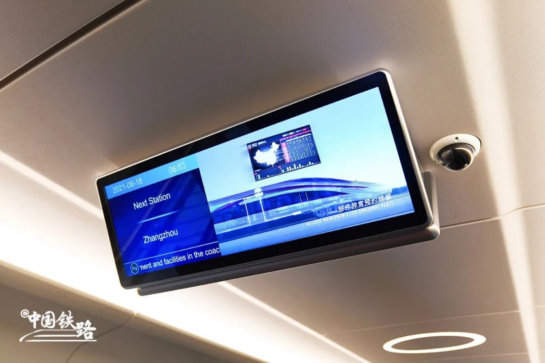 车厢顶部设置29英寸宽屏电视,可左右分屏同时显示列车运行和娱乐节目信息,大且气派。