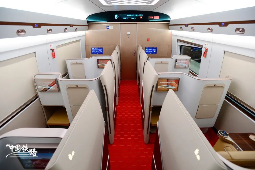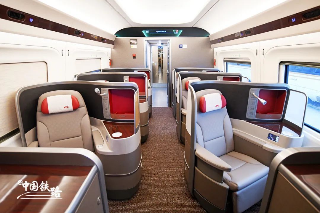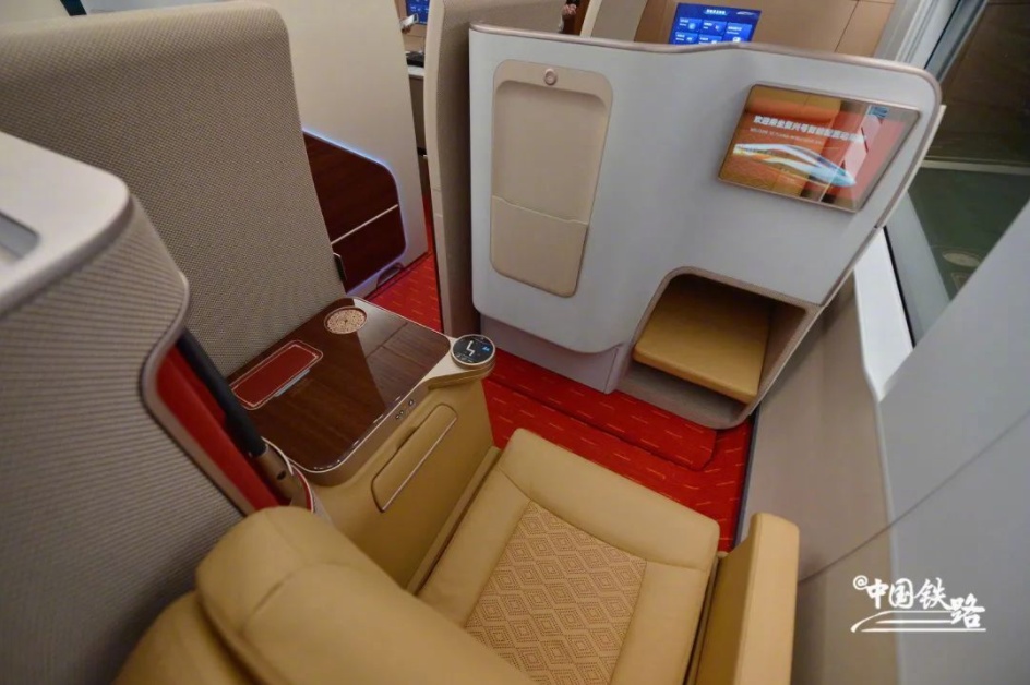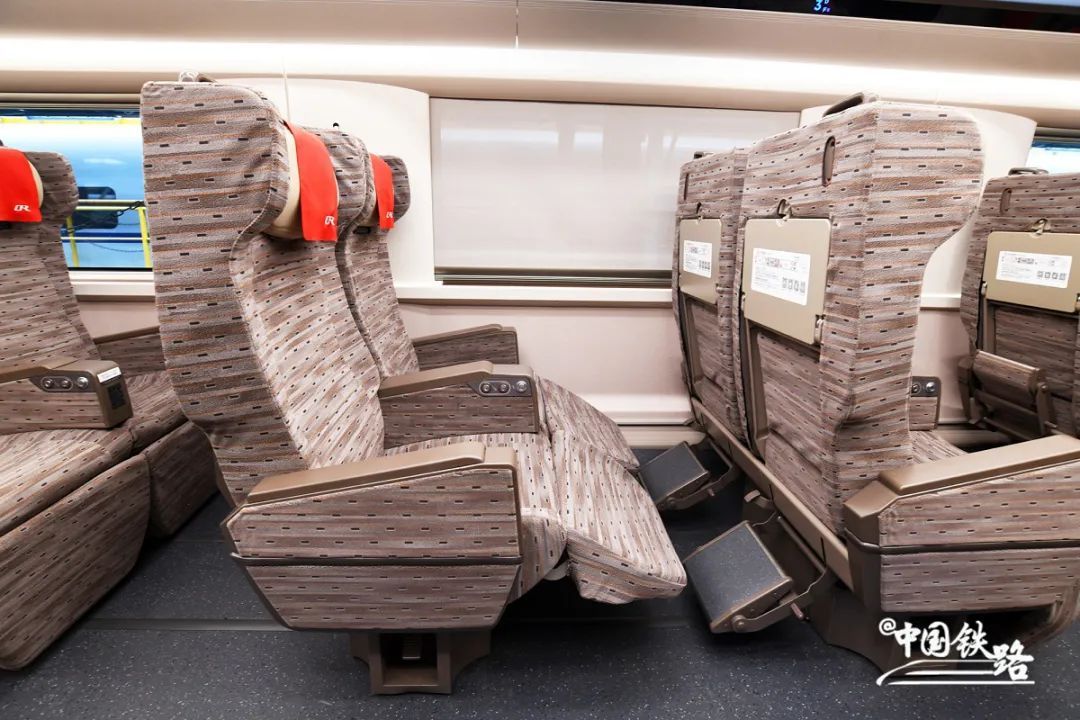 一等座椅增加了可调节头靠、电动腿靠等,将原来设置在座椅扶手上的小桌板改为设置在前排座椅靠背上。