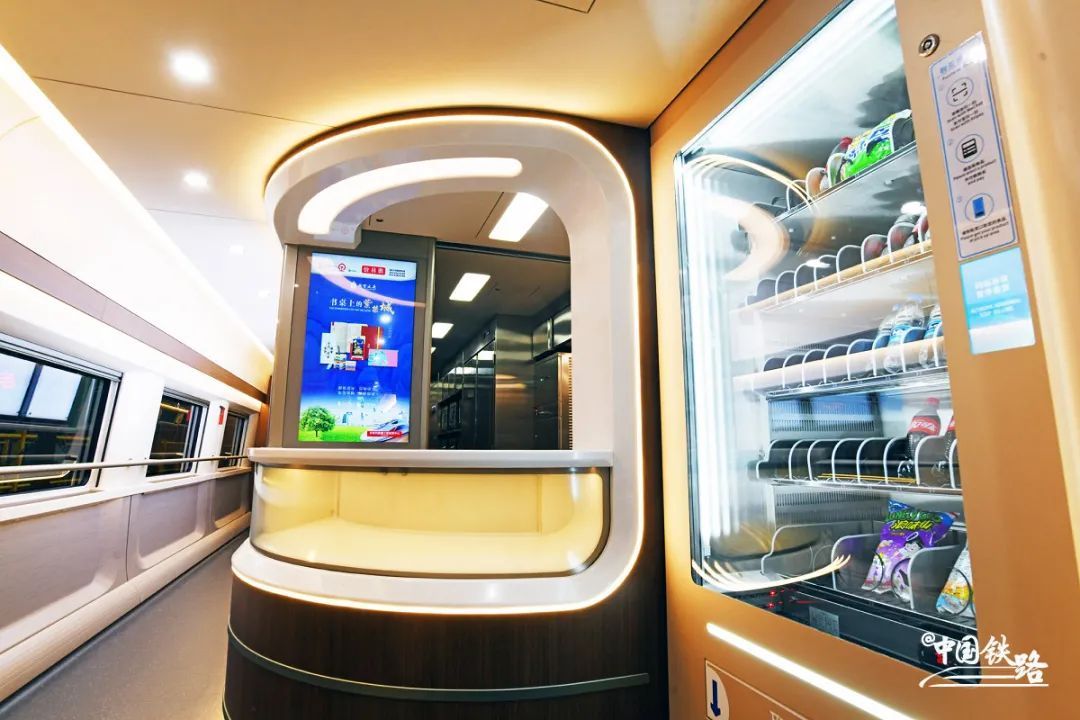 餐车增设1台自动售货机,可为旅客提供自助购买水果、饮料、零食等服务。乘务员说,这是智能复兴号独有的:“只需要扫码就可以买到自己要的饮料等等。”