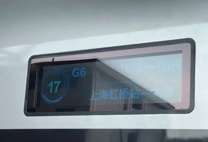 仔细一看,车身上显示屏的变化不小:类似科幻片的显示风格,车厢号周围闪烁灰蓝色线条圈,字体更粗,“G6 ,上海虹桥站到北京”,整体更具智能感。