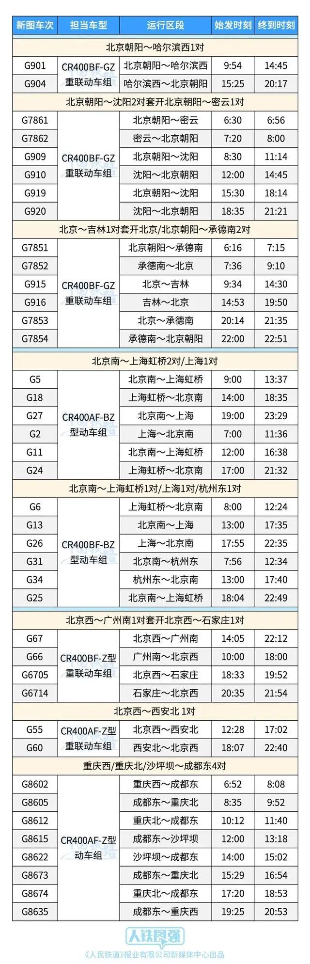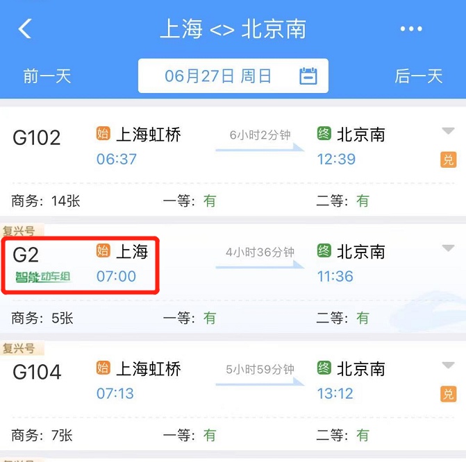 6月25日起,伴随着全国铁路第三季度列车运行图的实施,中国铁路上海局集团有限公司管内上海、杭州两地经京沪高铁至北京南站,安排了6对高铁列车使用复兴号智能动车组车底运行,具体车次为: