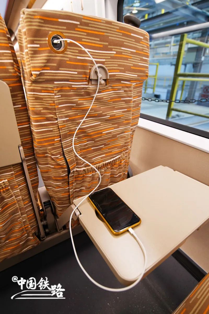 二等车厢的座椅靠背上全部都有USB充电口,加深小桌板杯托凹槽深度,增强水杯放置的稳定性。