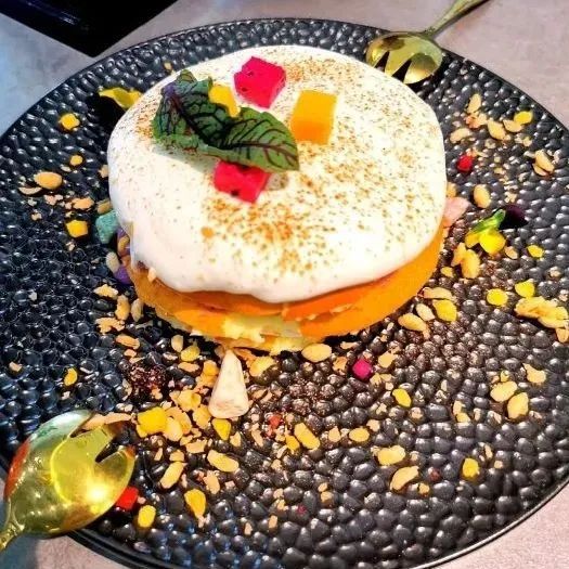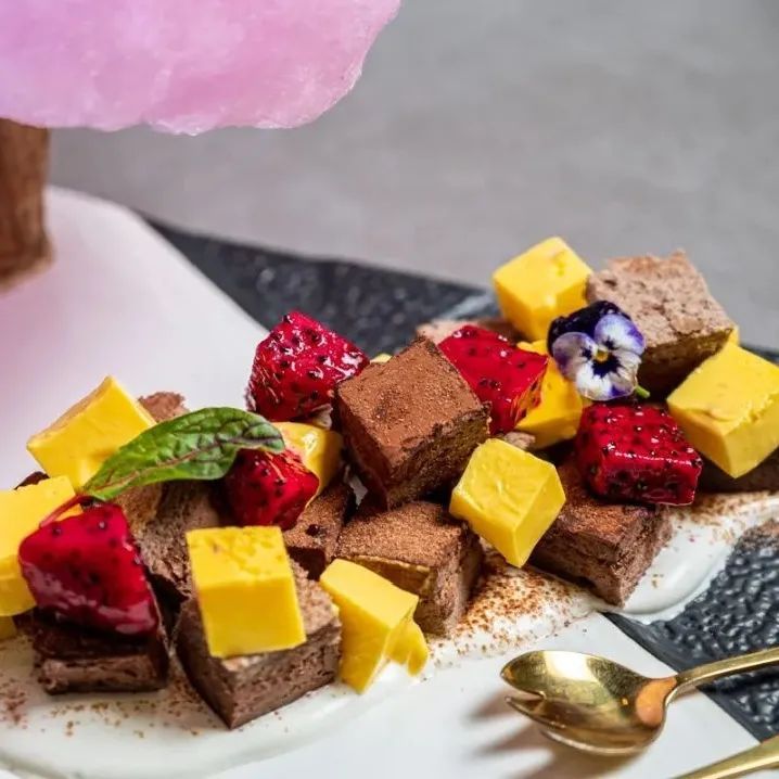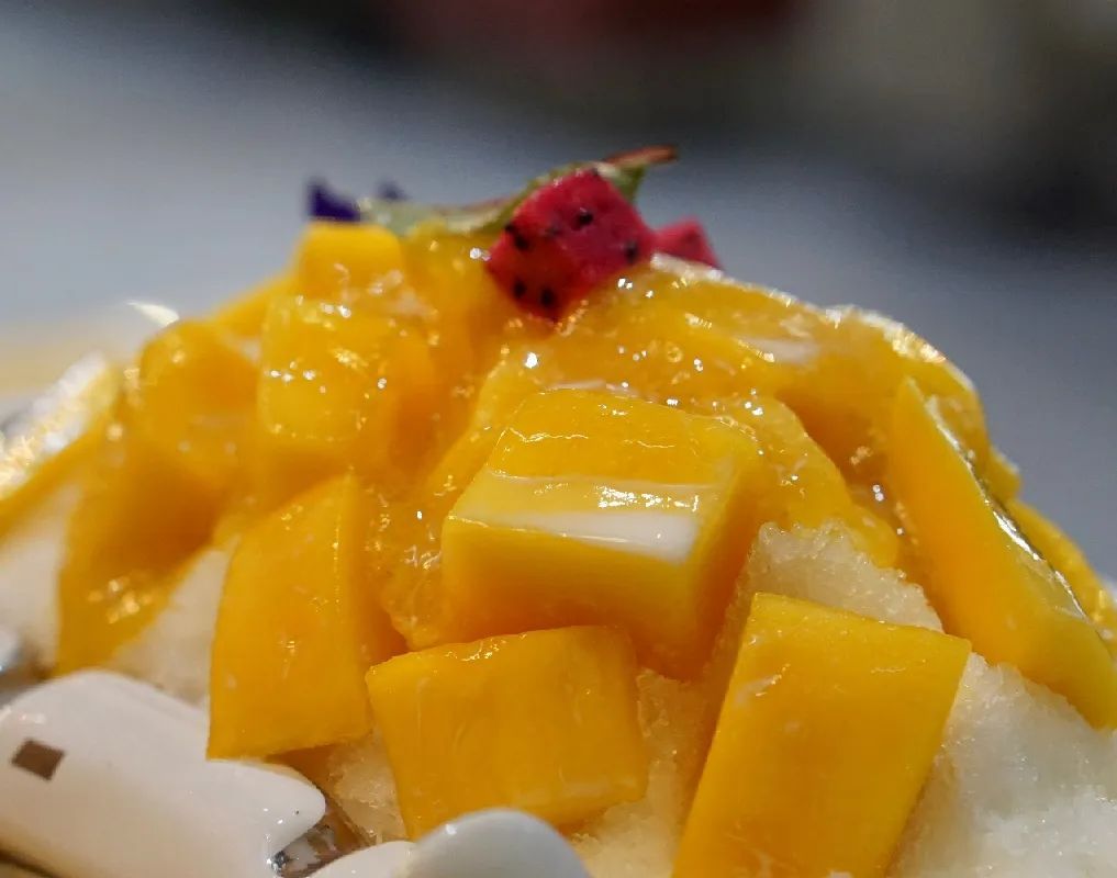 还有这道牛奶芒果冰!大块芒果覆盖在牛奶冰上,加以火龙果点缀,色泽诱人,光是看看就能激发出食欲。
