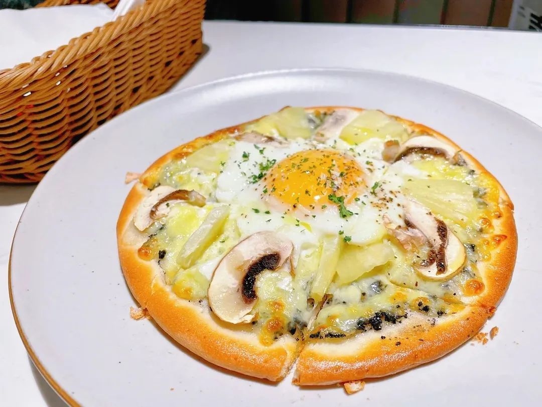 这道松露鸡蛋蘑菇披萨,鸡蛋爱好者们请码住!薄薄的披萨饼+半熟的流心蛋+蘑菇+小心机菠萝+松露,用一把叉子慢慢地戳破中间的蛋黄,让它流淌在每一块披萨上。