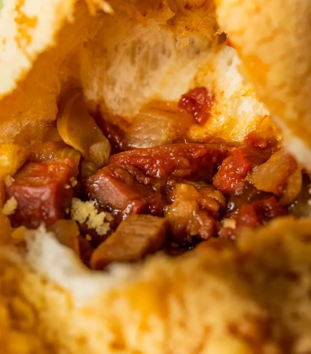 蚝皇叉烧包看起来平平无奇,谁能想到里面塞满了叉烧肉。味正量足,掰开之后,光是香味就诱惑到人了,紧贴着肉酱的那部分面包正是整个面包的精髓。