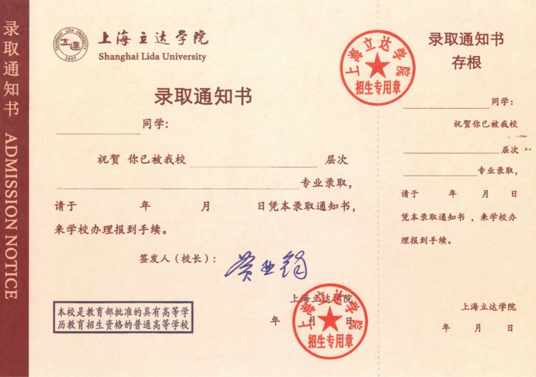 上海立达学院录取通知书正面以立达红为底色,红色象征热情,积极。学院以热情迎接新同学入校学习,也希望同学们以热情积极的态度进入大学生活。正中央的校徽以隶书书写校名,体现学院丰厚的文化底蕴,校徽之上是以学院行政楼为主题的俯视图,向学生展示优美的校园环境。