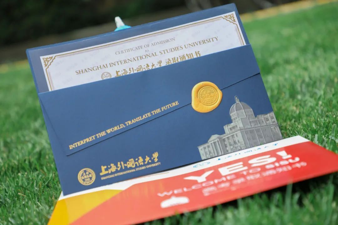 上海外国语大学本科录取通知书采用信封样式,寓意开启未来。封面上醒目的英文校训“诠释世界 成就未来”与加盖的金色火漆印章相得益彰,包含融通中外之意。