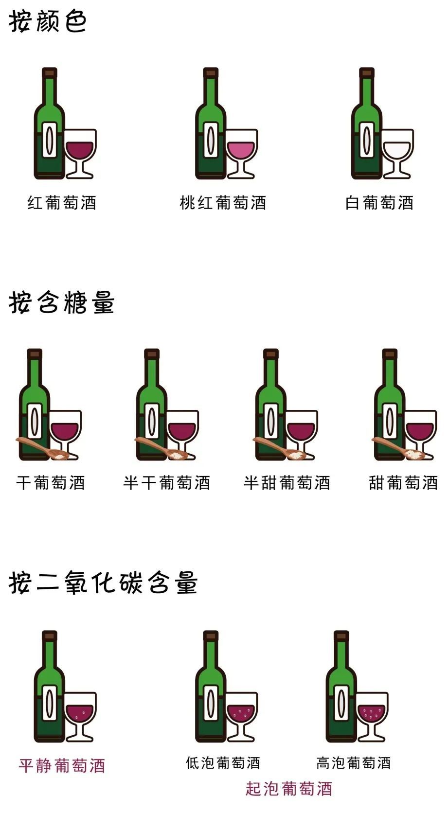 除了让人眼花缭乱的葡萄品种,葡萄酒的类别也是五花八门。其分类如下:
