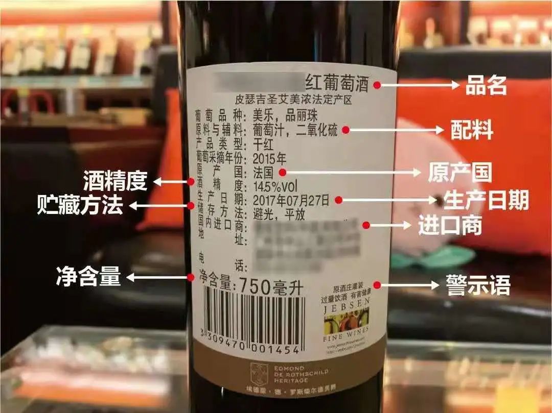 根据我国国家标准规定,进口葡萄酒,必须加贴中文标签,其功能跟我们的身份证类似。一张合格的进口葡萄酒中文标签必需标注9项内容:品名、原料与辅料、原产国(地)、酒精度、生产(灌装)日期、贮藏方法、净含量、警示语、进口商或经销商信息(名称、地址和联系方式)