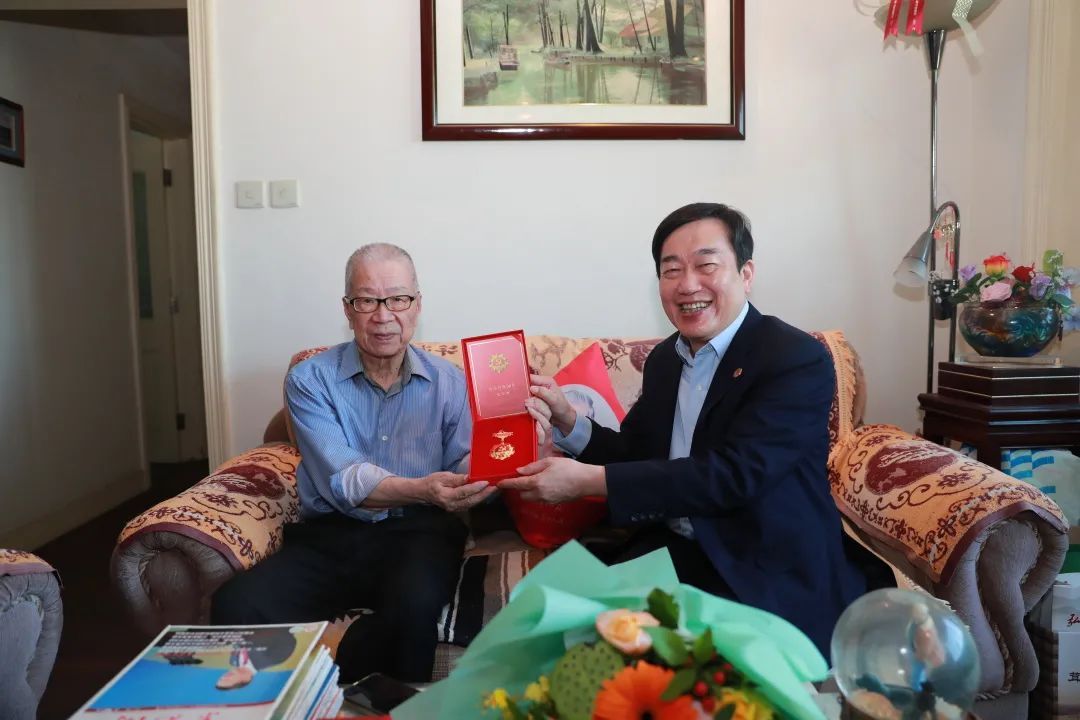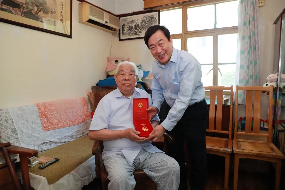 许宁生看望了复旦大学原校长、中国科学院院士、核物理学家杨福家,为他颁发了纪念章,称赞他为教育国际化所做出的杰出贡献。1955年入党的杨福家,终身致力于物理学研究,在1993年至1998年间担任复旦大学校长,他以宽阔的国际视野引领着全校师生,培养了一批批优秀的青年人才。