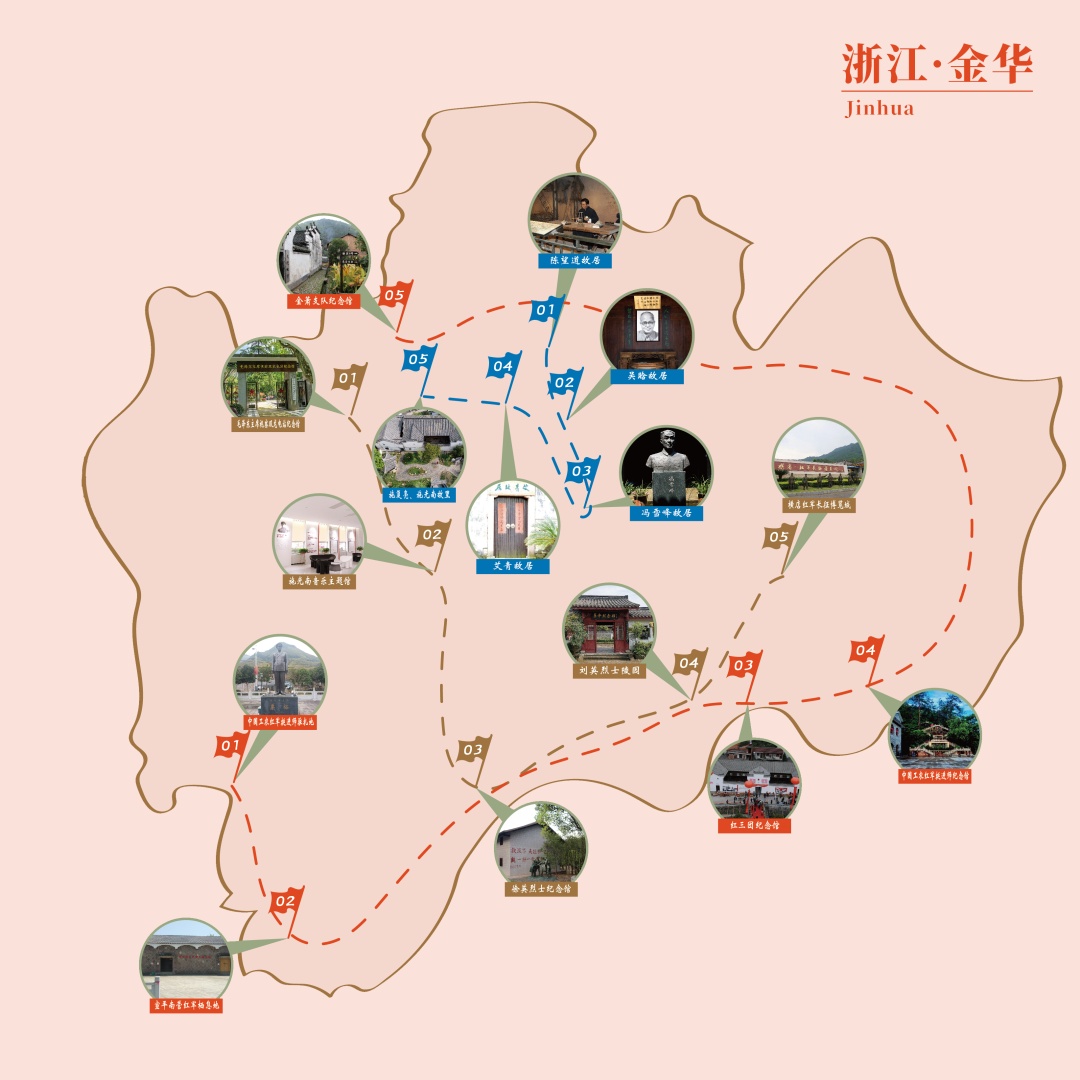义乌市分水塘村“望道信仰”红色旅游景区(陈望道故居)→义乌市上溪镇苦竹塘村(吴晗故居)→义乌市赤岸镇神坛村(冯雪峰故居)→金东区傅村镇畈田蒋村(艾青故居)→金东区源东乡东叶村(施复亮、施光南故里)