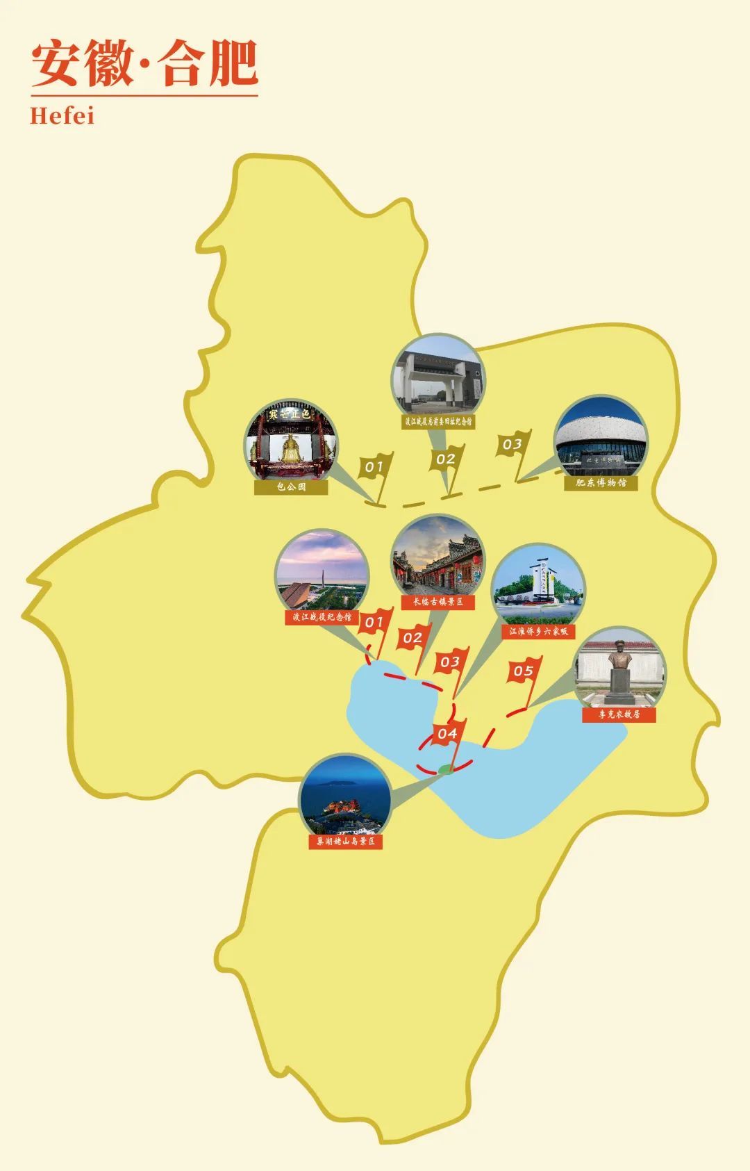 渡江战役纪念馆→长临古镇景区→江淮侨乡六家畈→巢湖姥山岛景区→李克农故居