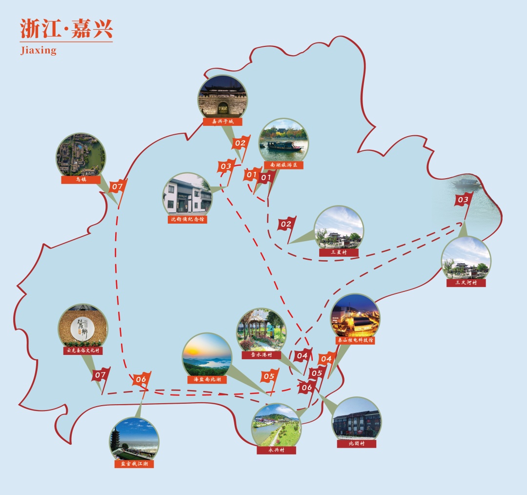 南湖旅游区(南湖革命纪念馆、南湖红船)→嘉兴子城(嘉兴起义史料陈列)→沈钧儒纪念馆→秦山核电科技馆→海盐南北湖→盐官钱江潮→乌镇