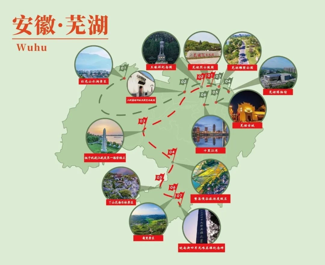 红色山水涧景区→六洲暴动旧址及胡竺冰故居→芜湖雕塑公园→芜湖博物馆→芜湖古城→十里江湾