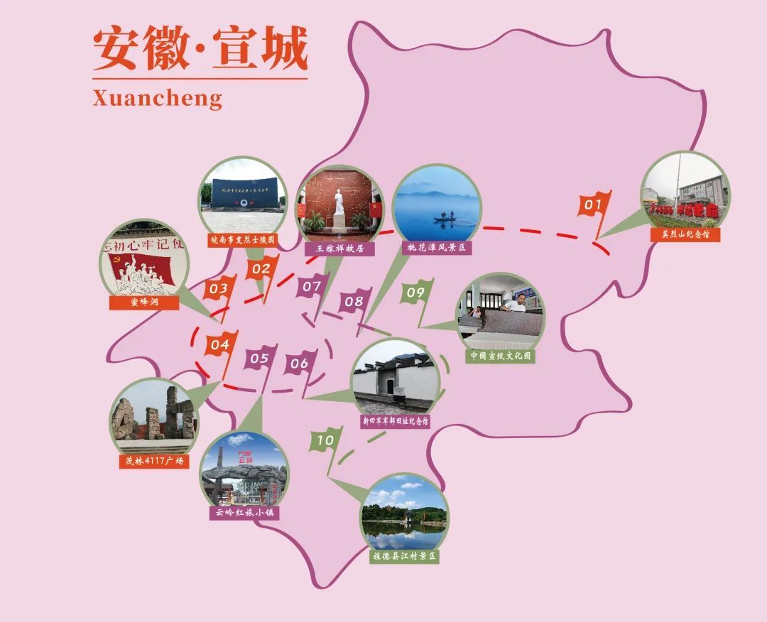 线路包含宣城市三县市红色旅游景区,其中以泾县云岭新四军军部旧址为核心,全面展示新四军的发展壮大历程,铁军精神内涵和形成,弘扬铁军精神新时代在宣城市的成功实践。