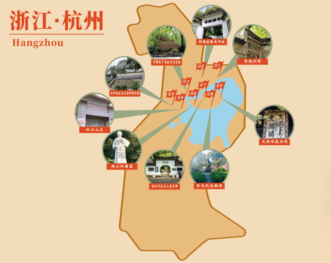 坚匏别墅→浙赣铁路局旧址→中国共产党杭州历史馆→秋水山庄→五四宪法历史资料陈列馆→孤山秋瑾墓→西泠印社汉三老石碑→鲁迅纪念铜像→文澜阁