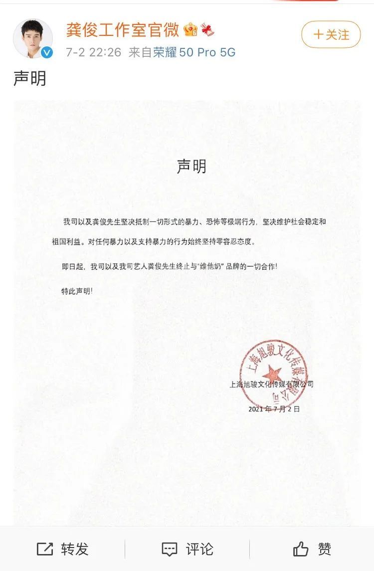 7月2日22时许,品牌代言人龚俊及任嘉伦均发布声明,宣布终止与维他奶品牌的一切合作。