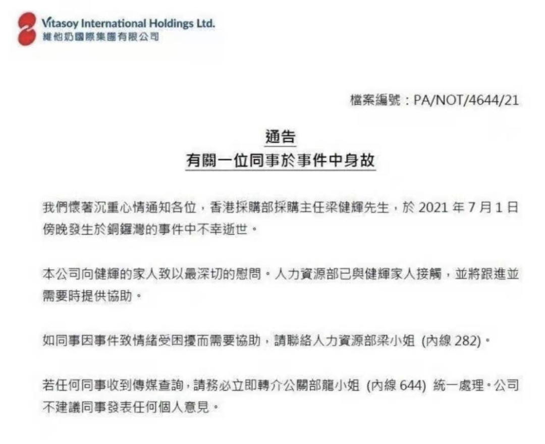 但是,维他奶公司向员工发出的内部通告昨日流出,通告称,梁建辉于事件中不幸逝世,对他的家人致以最深切的慰问。