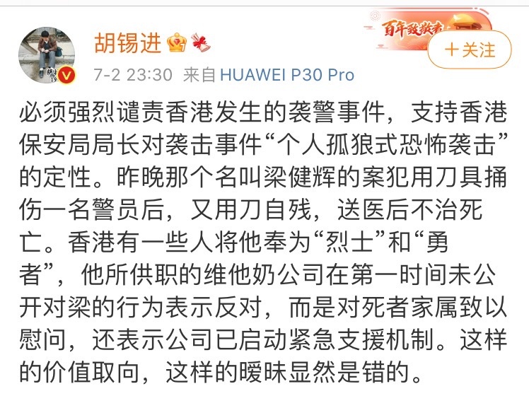 7月1日晚,中国香港一名警员在铜锣湾遇袭受重伤,疑凶自杀送院抢救后不治身亡。凶徒为维他奶公司采购部职员,维他奶公司向员工发出的内部通告被外界批评是美化及纵容暴力。