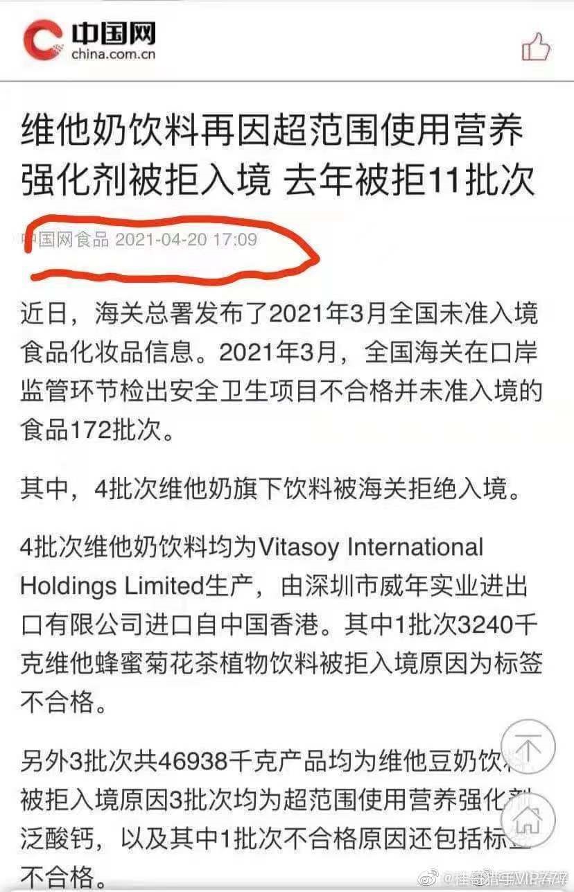 在今年三、四月份,维他奶就因食品安全检测不合格,多次被海关拒绝入境。