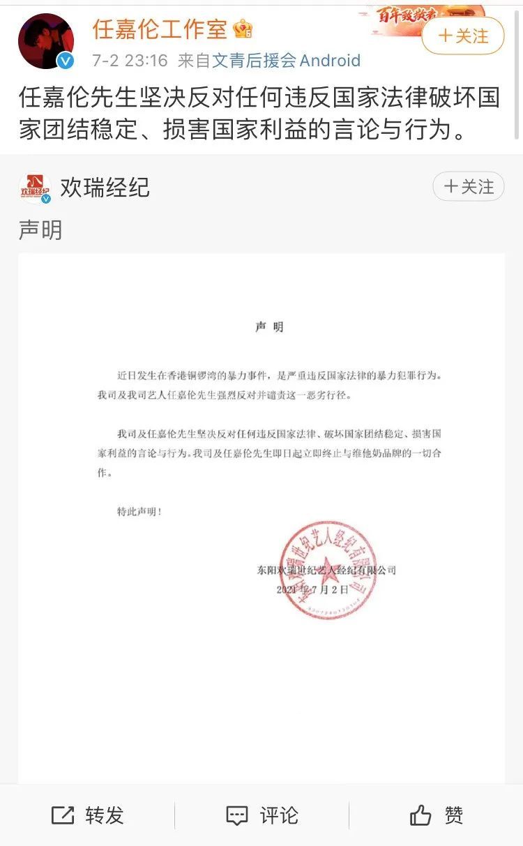 任嘉伦的经纪公司欢瑞世纪发也声明表示,终止与「维他奶」品牌的一切合作,「任嘉伦先生坚决反对任何违反国家法律破坏国家团结稳定、损害国家利益的言论与行为。」