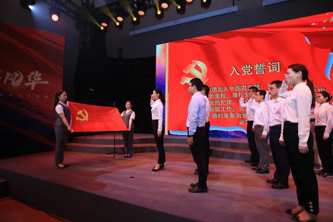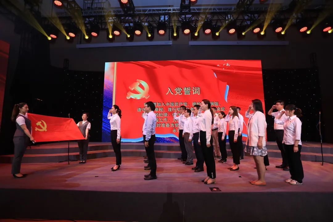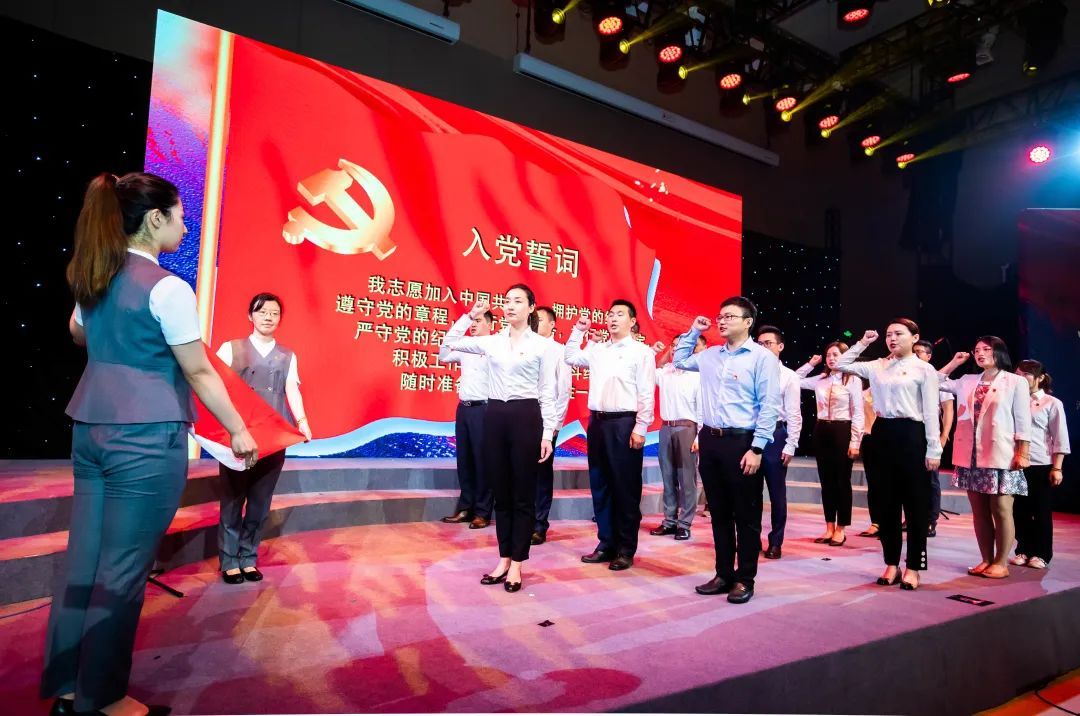 一批新党员面向党旗,在活动现场进行庄严宣誓。
