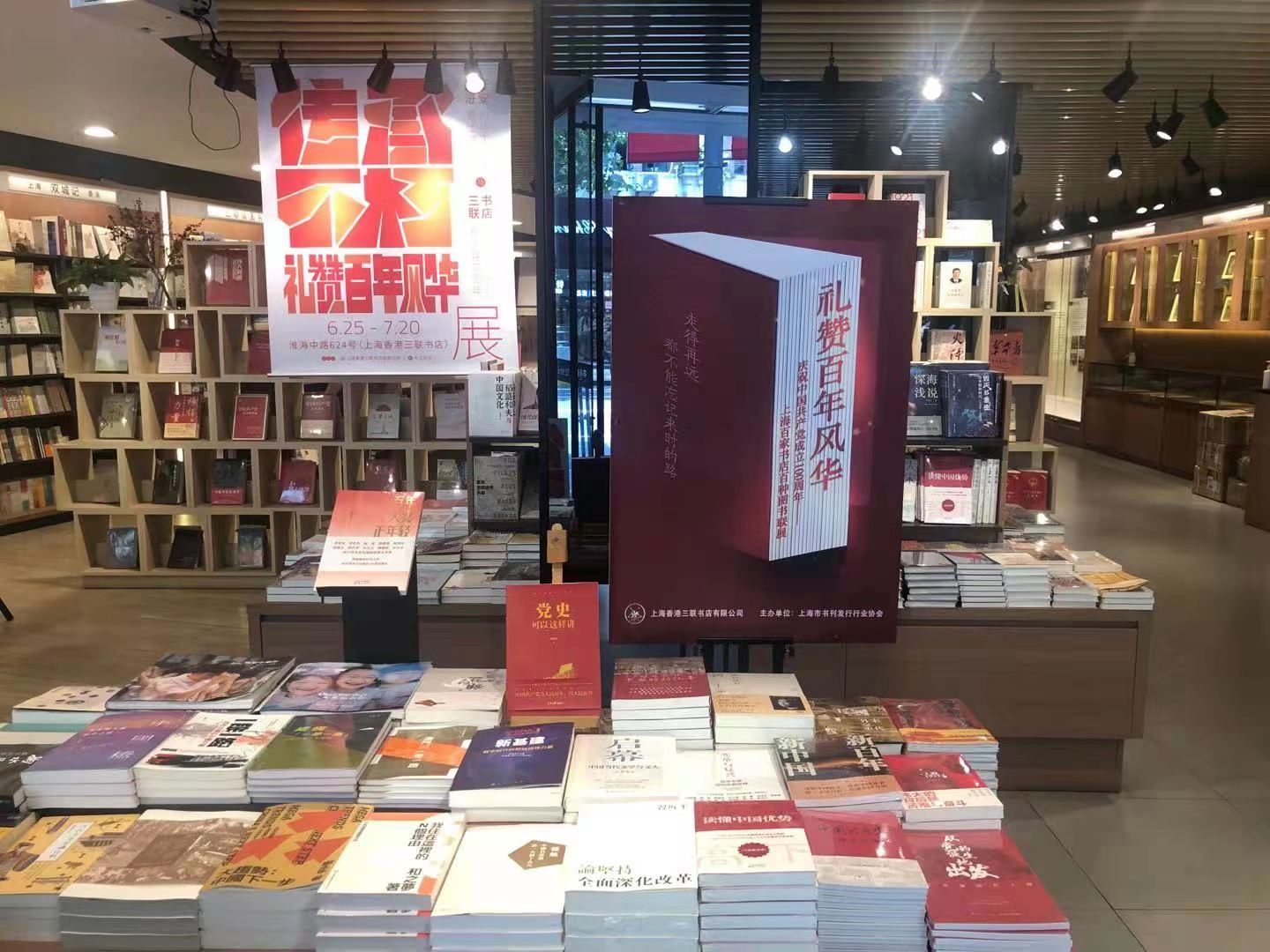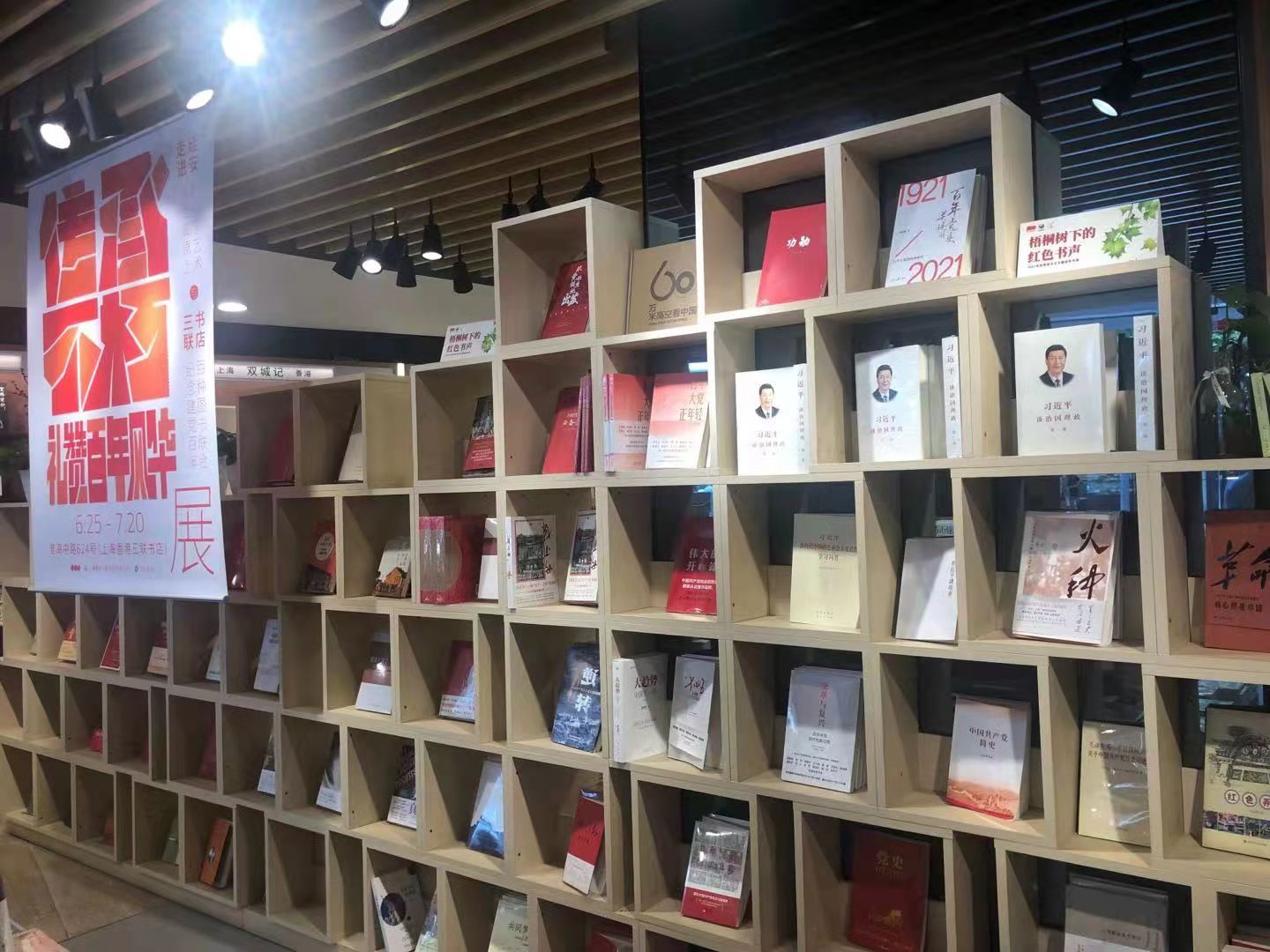 走进上海香港三联书店,书店内布置了以“传承不朽-礼赞百年风华”为主题的红色艺术展。展览以庆祝中国共产党成立100周年为主线,由百种党建图书展、“把读者放在心中-韬奋与三联书店”史料展以及“走进延安-黄土高原上的补丁艺术展”组成,融合图书、图片、历史实物原件、文创产品等。