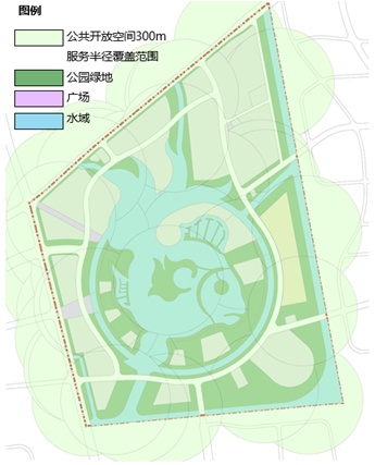 从人群需求角度,配置不同种类开放空间,公共开放空间300米服务半径覆盖率达到100%。