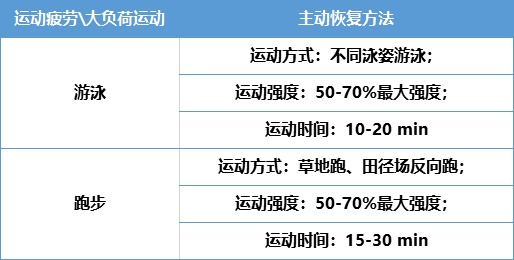 大量实践证明,积极性主动恢复较消极性被动恢复会加快血乳酸和次日晨血清肌酸激酶(CK)的清除速率。据报道,游泳运动员大强度运动后采用50-70%最大摄氧量强度进行运动,与运动后随便放松恢复的运动员比较,乳酸消除率和次日晨CK下降很快,恢复速度明显加快。