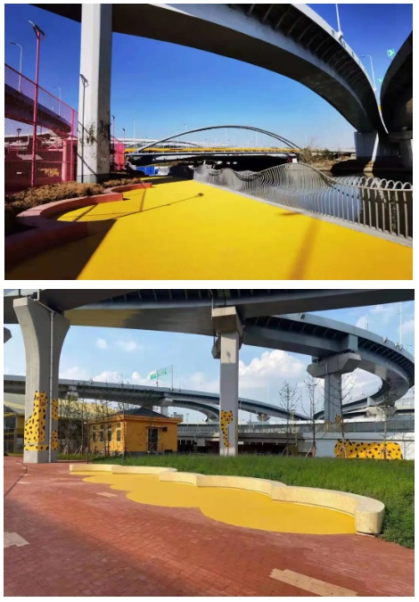 位于苏州河中环桥下的空间更新项目,新建设的粉红火烈鸟、深黄猎豹、黑白条纹斑马主题空间,也设置了休憩座椅,方便市民沿线休憩,色彩鲜明的图案十分抢眼夺目。