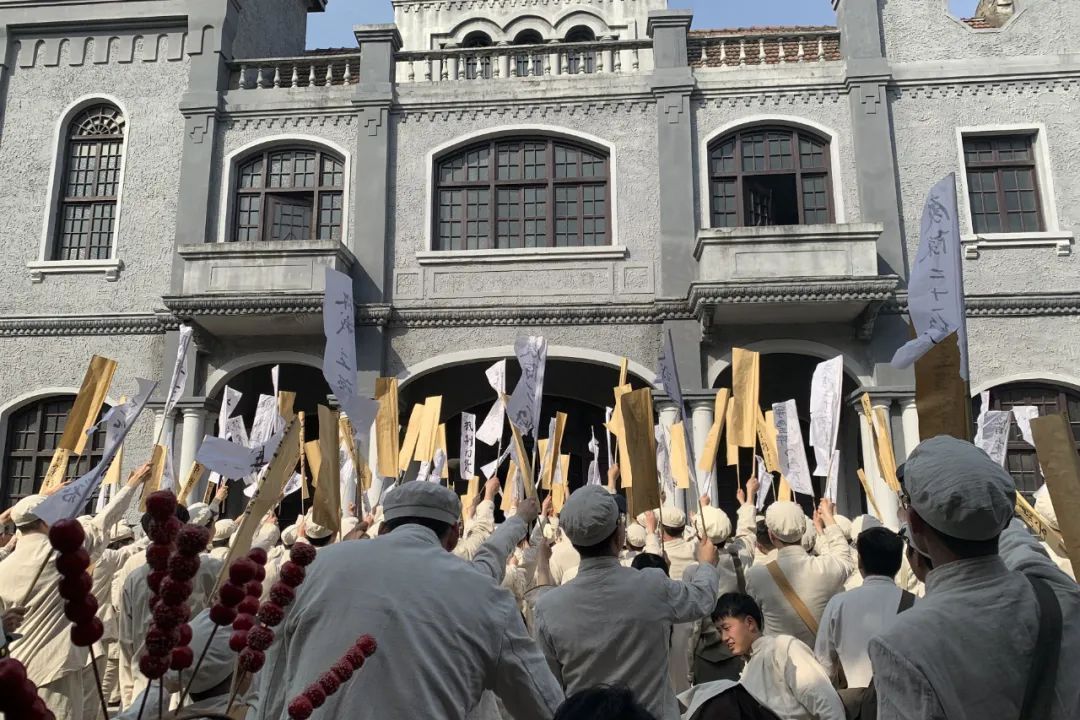 今年5月3日,他和同学来到上海胜强影视基地,以群众演员的身份参演五四运动中的有志青年,这段演出出现在《1921》最开始的部分——一群青年聆听李大钊宣传马克思主义、鼓舞青年团结起来救亡图存的演说,他们高举横幅、振臂高呼“还我山东,严惩国贼”,为争取民族独立发出声声呐喊。