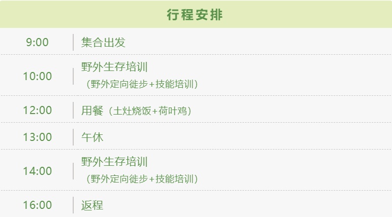 围绕荒野生存必备的四个生存要素:水源、火源、食材、庇护所为核心,以野外定向徒步形式融合野外生命安全,在加强体能训练基础上,教给青少年终生受用的生存技能。