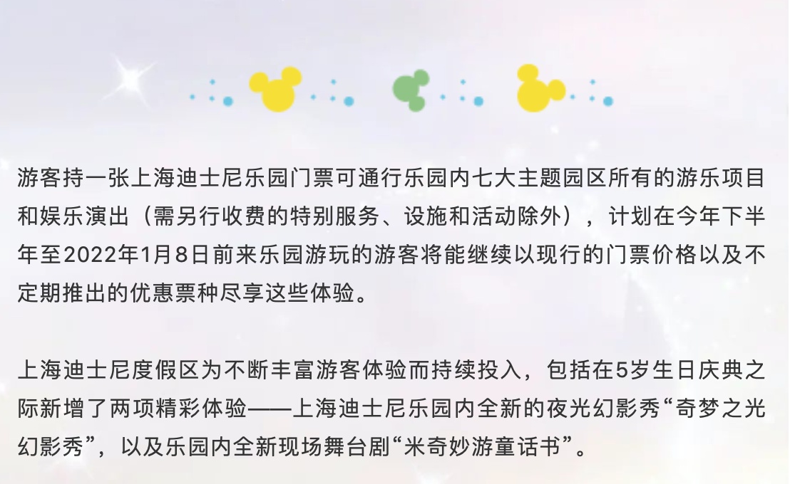 上海迪士尼乐园的年卡现行价格将在此次票务方案调整生效后的一段时间内保持不变。