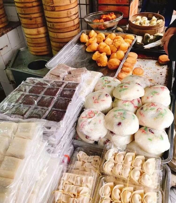 点心铺门口,时常排起长队,有包子、八宝饭、馄饨、米糕、油墩子、烧麦……分量很足价格也很实惠。