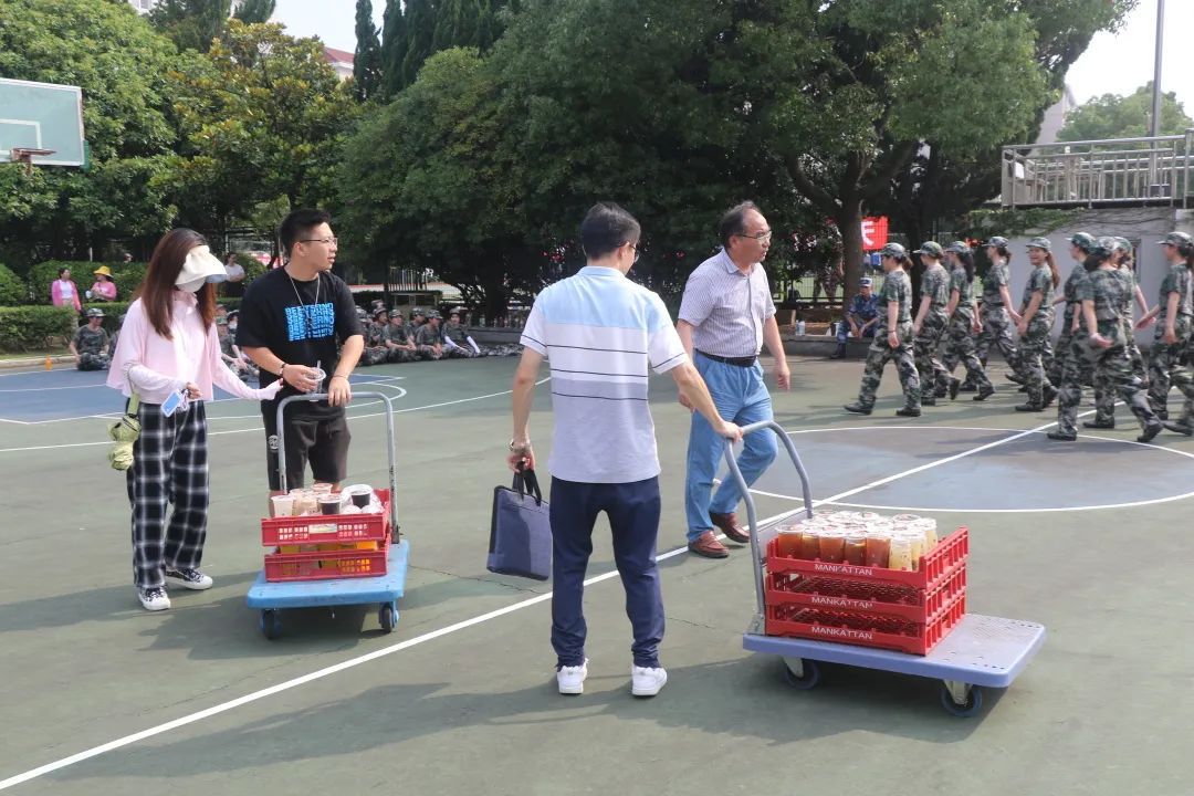 同学们军训忙,学校老师也没有闲着。老师们纷纷化身志愿者,为军训学生提供帮助服务。训练场上化身送水志愿者,为同学们运送饮料和矿泉水;校门口化身平安志愿者,维持道路交通秩序。
