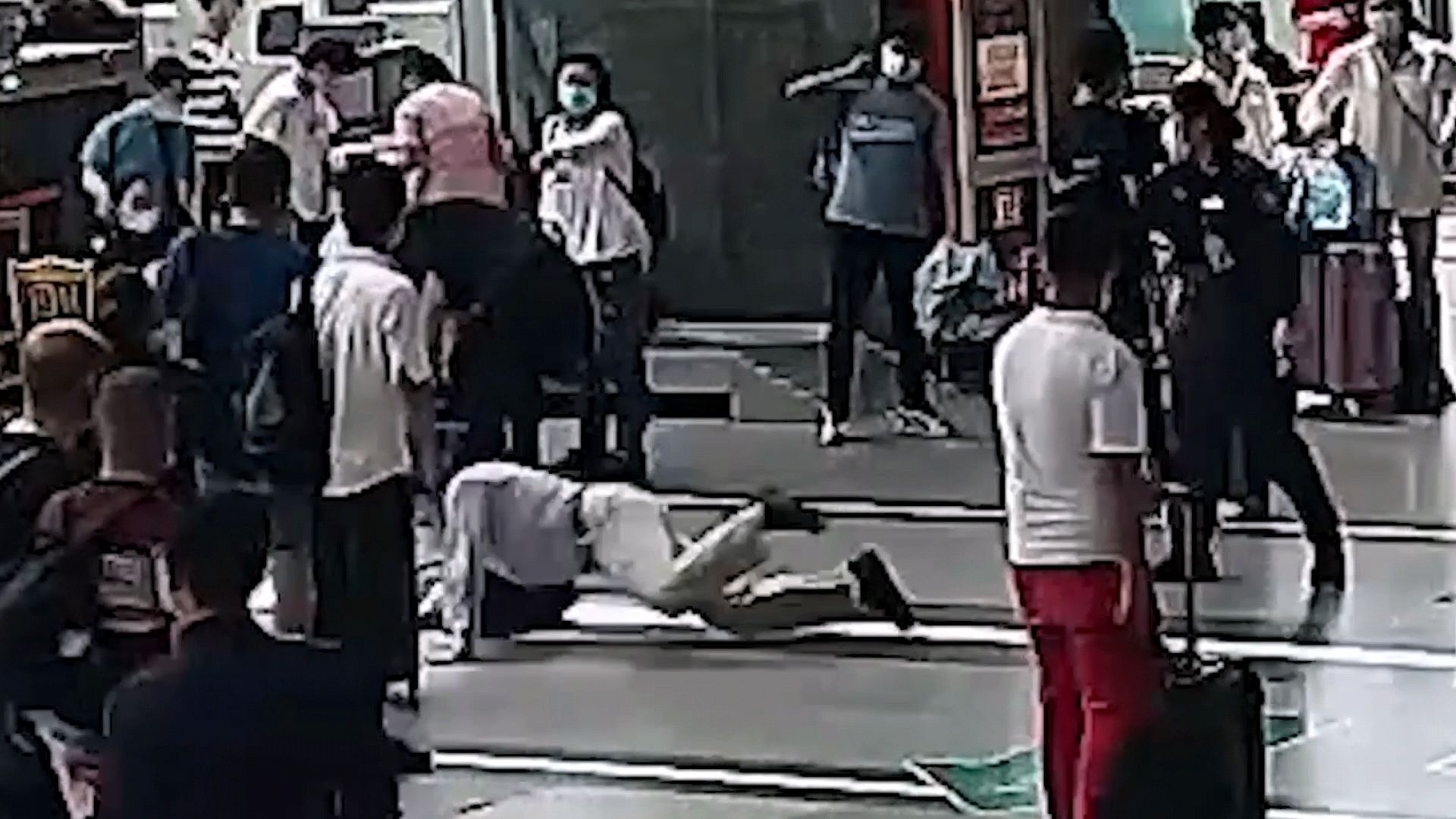 十几秒钟后,受害人黄女士和丈夫郭先生发现,范某立即向候车室外逃跑,此时,郭先生和一名热心旅客立刻追了上去,没跑多远,仓皇而逃的范某摔倒,被赶来的民警和郭先生摁倒在地。