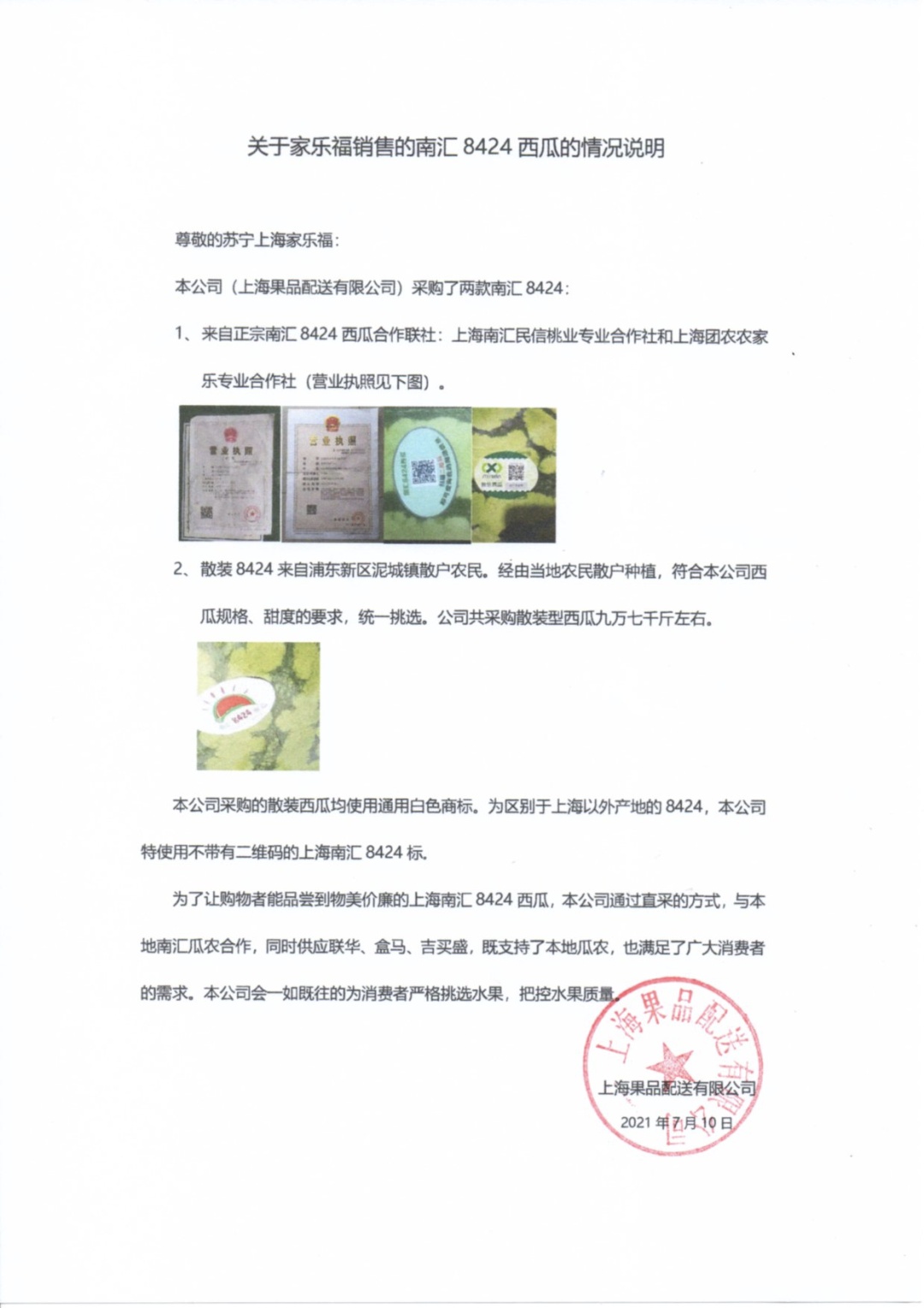 对此,苏宁上海家乐福方面回应媒体,其供应商上海果品配送有限公司采购了两款南汇8424,来自正宗南汇8424西瓜合作联社:上海南汇民信桃业专业合作社和上海团农农家乐专业合作社(营业执照见下图)。