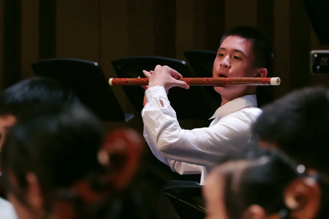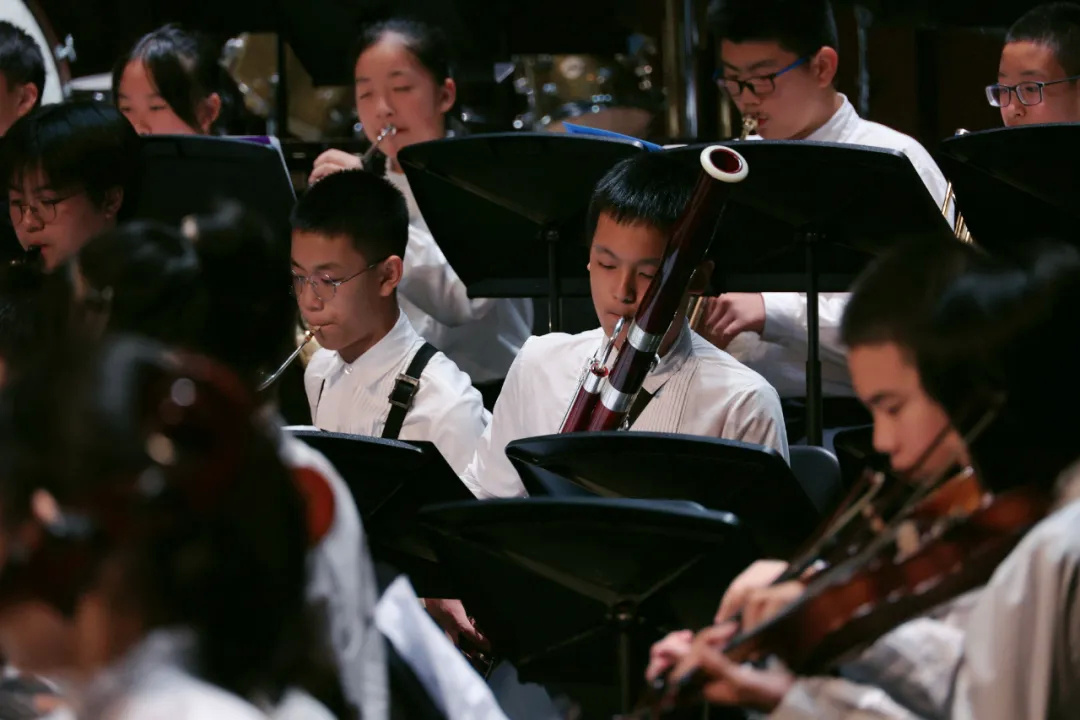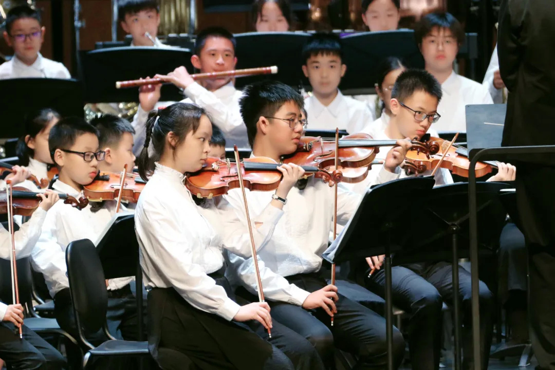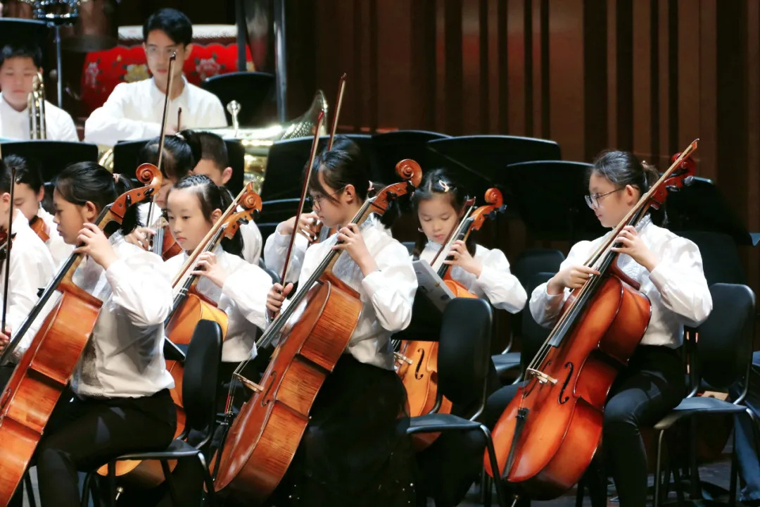 “我们乐队编制有弦乐组、木管组、铜管组、打击组、特色乐器组,可以说是交响乐团最标准的配置。学生年龄从二年级到高中都有,教师也有十几名。”说起如今乐队的规模,70多岁的张世光老师眼里闪着光。对他来说,交响乐团就像他的孩子,或许没人比他对乐团的成长有更深的了解。