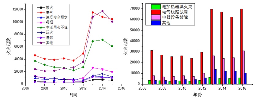 下面这张图是对2007-2016年的火灾原因统计和电气火灾原因的统计结果。