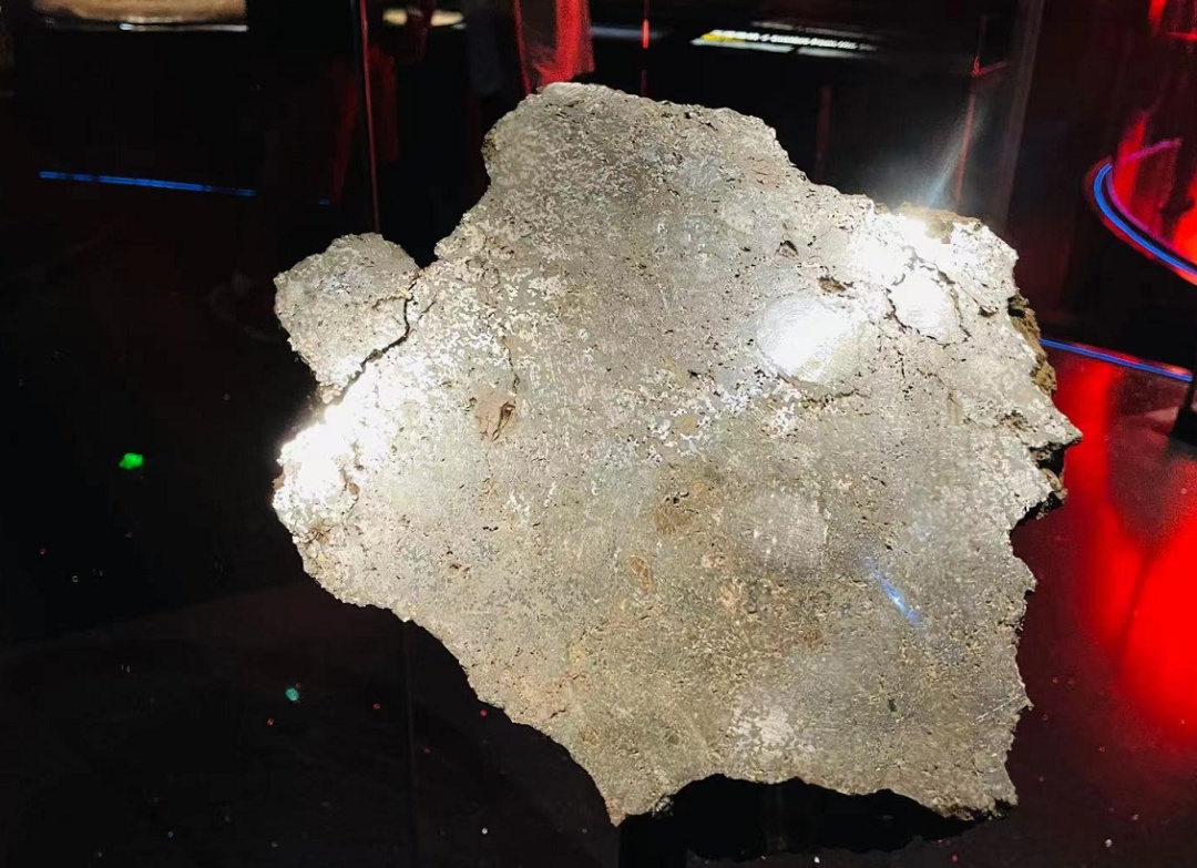 1995年9月7日,内蒙古东乌珠穆沁旗地区上空,陨落了中国唯一的一次目击中铁陨石,共回收了128.8千克。天文馆收藏的这块是从回收最大的一块上切割而来的。