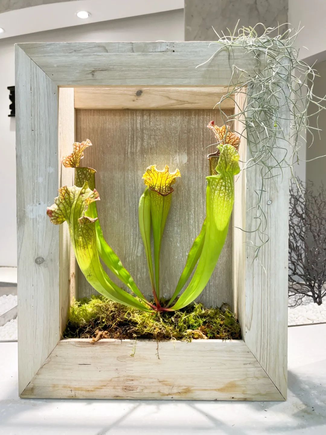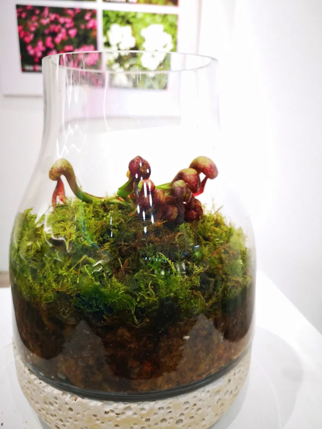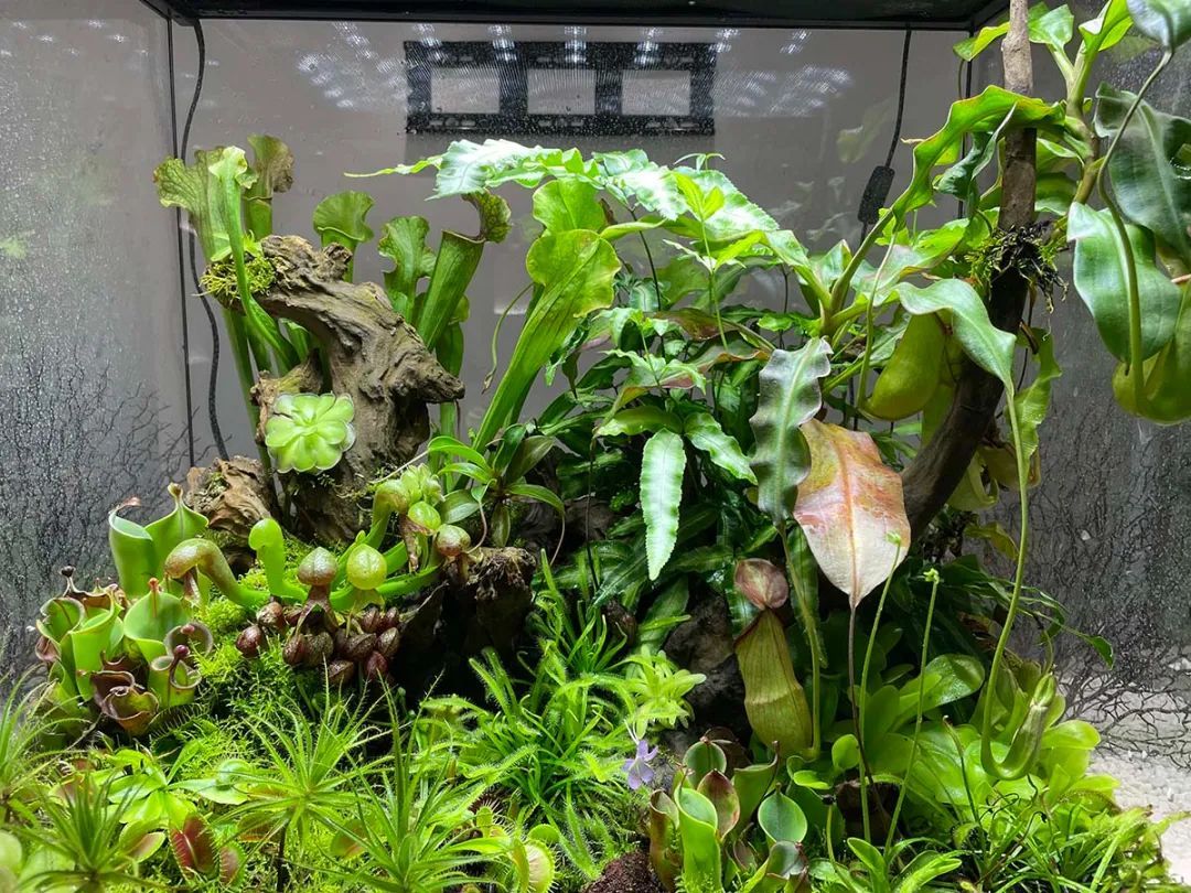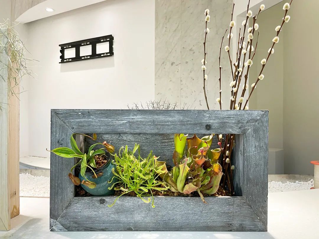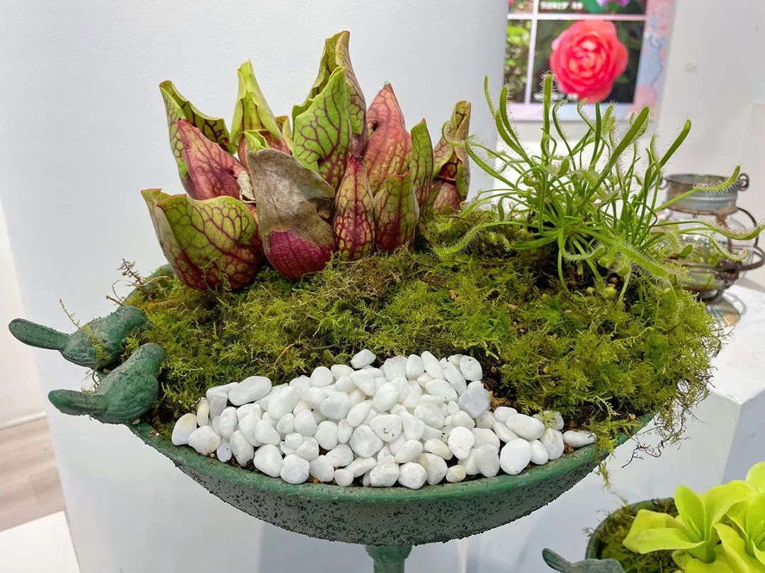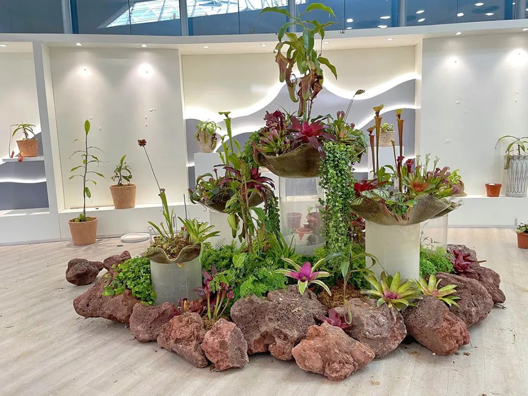 共享空间展区则主要展示植物的个体之美,对猪笼草、食虫组合、瓶子草和土瓶草之间的协同进化进行展示。其间以组合盆栽、玻璃生态缸、玻璃容器、小场景等多种展览形式,搭配观赏凤梨、秋海棠等植物,提升展馆的整体观赏效果。