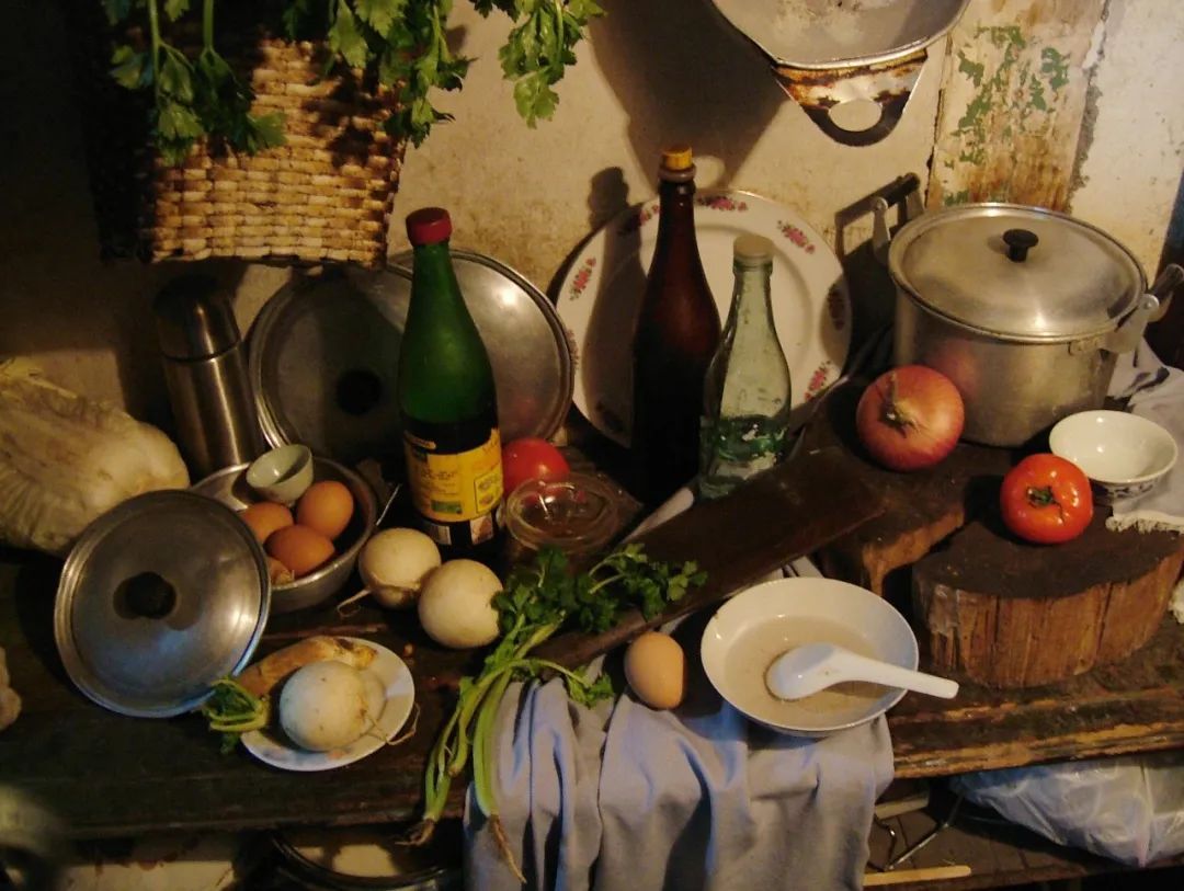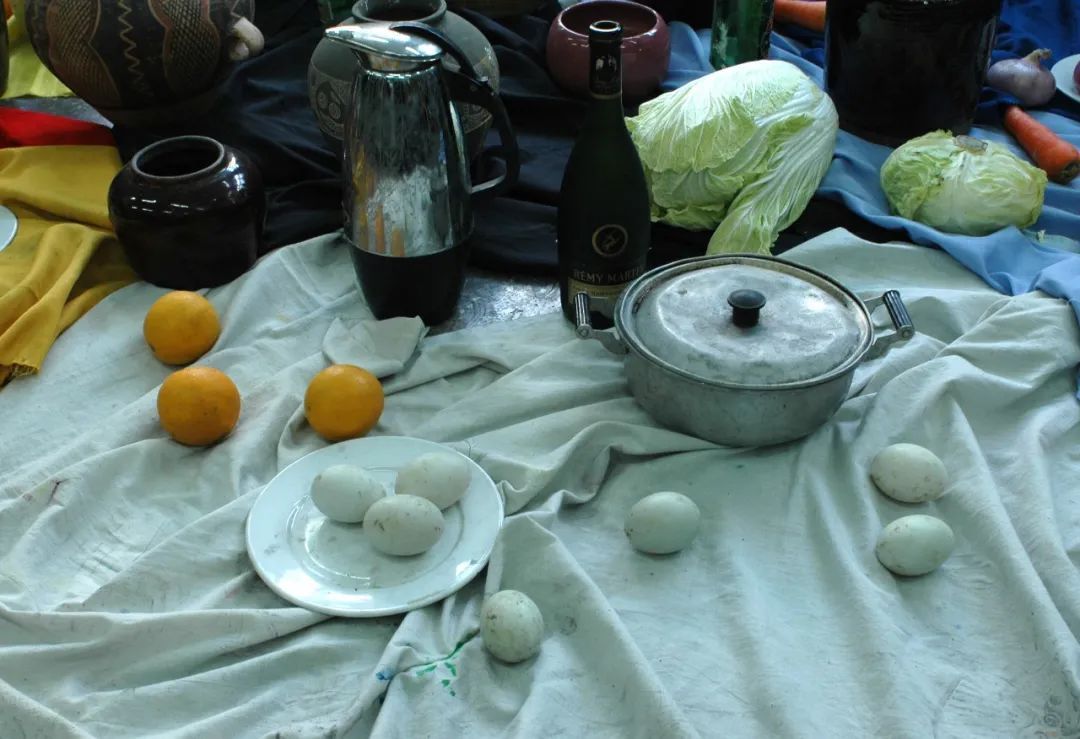 内容:白色、蓝灰衬布各一块;大白菜、卷心菜、鸭蛋、桔子若干;白瓷盘一只;不锈钢水壶一只、深色酒瓶一只、深色陶罐一只、白色碟子一只。